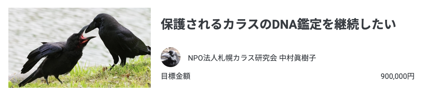 「いつもご支援くださりありがとうございます。皆様におかれましては、いかがお過ごしでしょうか?私はリハビリしつつ平常へ戻りたいと日々奮闘しております。「NPO法人札幌カラス研究会の活動費を維持したい」READYFORで継続寄付を開始いたします。